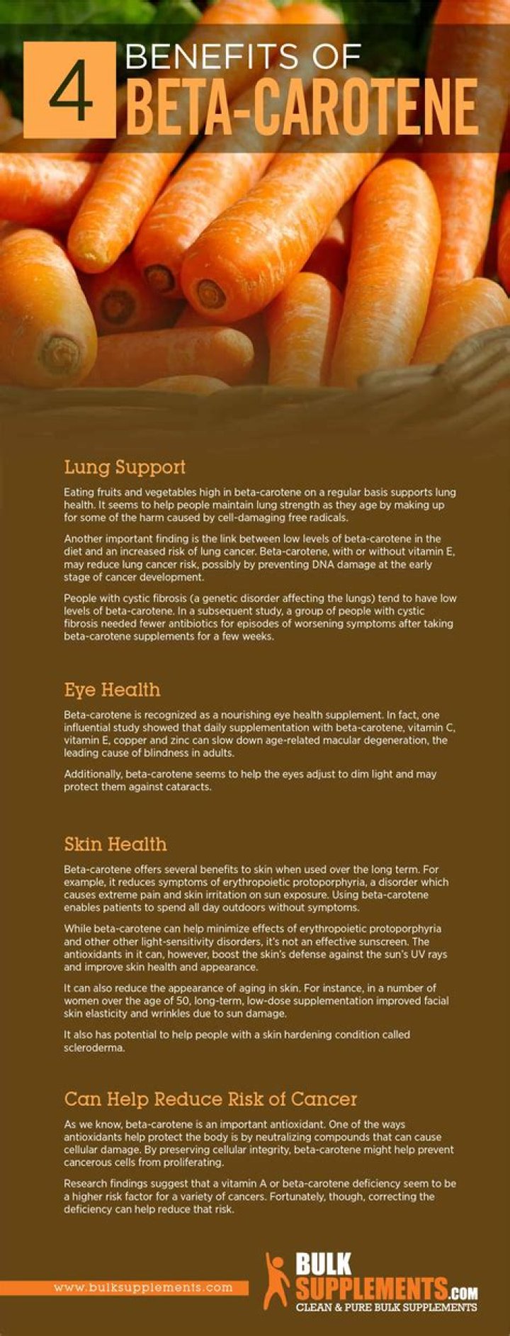 To prevent cancer Available evidence does not support the use of beta carotene supplements for preventing cancer. In fact, high beta-carotene intake has been linked to higher risk of lung cancer in male smokers and aggressive prostate cancer.