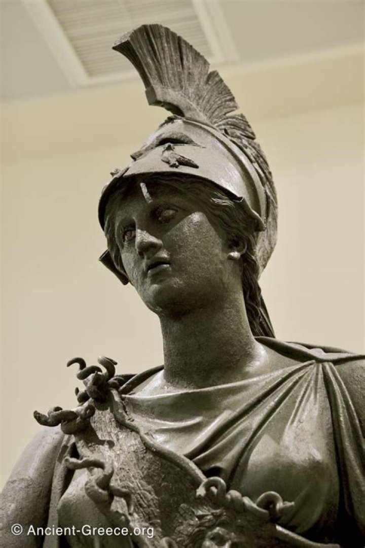 Athena. Roman name: Minerva. Spheres of influence: cunning (metis), battle, weaving, crafts, fertility of olive tree. Attributes: helmet, armor, spear, aegis, + woman’s dress, snake, owl. Epithets: Pallas, Parthenos, Grey-eyed goddess.
