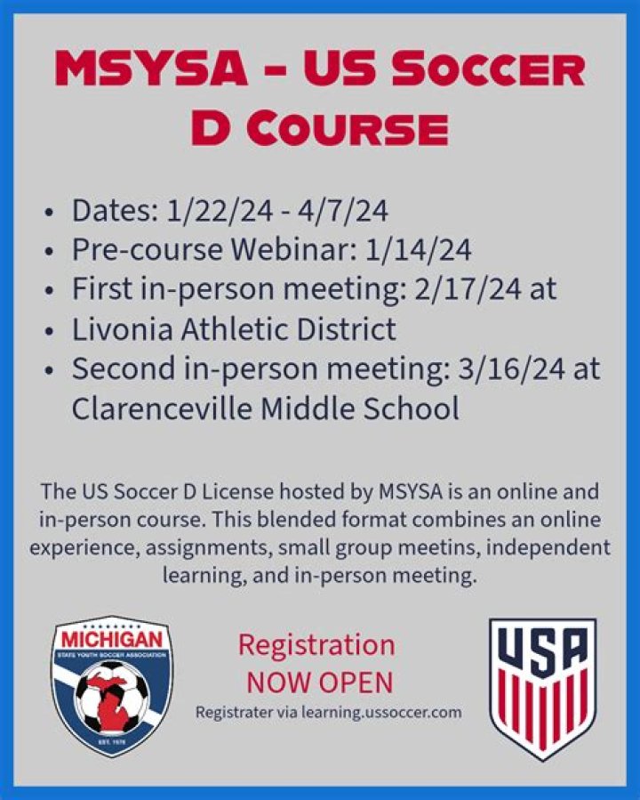 Eligibility. Completing a minimum of two in-person courses (one of which must be the 11v11 course) and one of the online courses earns eligibility for taking the D license course. If you currently hold an E license: you advance to the D license by completing the cost-free Introduction to Grassroots Coaching module.