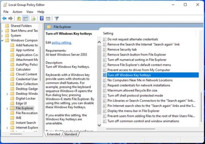 Navigate to User Configuration -> Administrative Templates -> Windows Components -> File Explorer . In the right-side pane, double-click on the Turn off Windows Key hotkeys policy to edit it. Select the Enabled option and click Apply and then OK. Reboot the computer to apply the changes.
