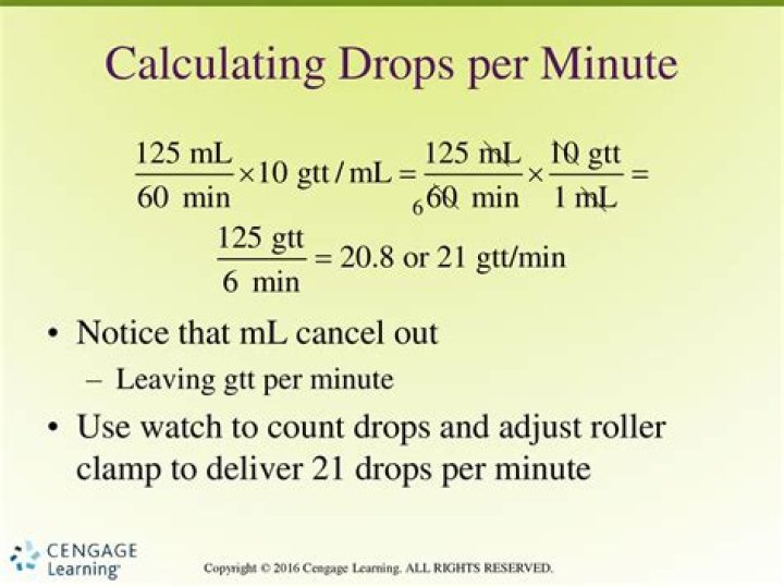 Drop Factor = 60 drops per mL. = 83.833 ≈ 84 drops/minutes . The formula to calculate how many hours will it take for the IV to complete before it runs out is: Time (hours) = Volume (mL) Drip Rate (mL/hour) .