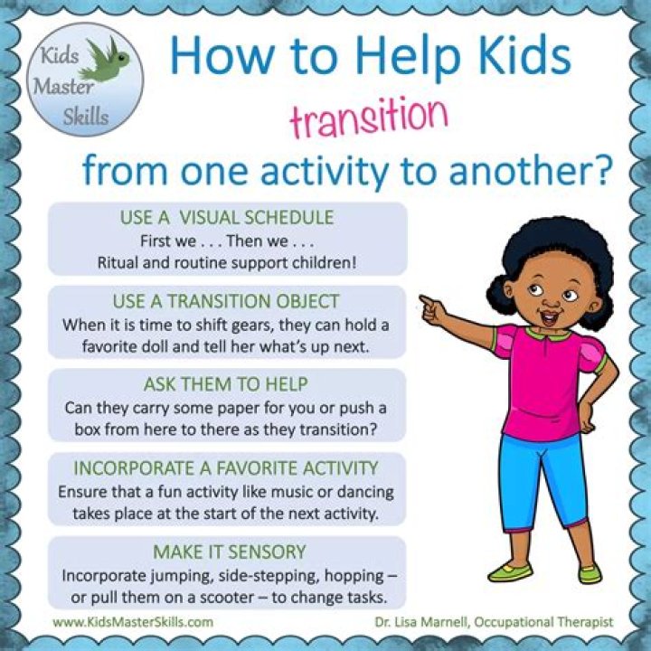 When helping kids with transitions, getting their attention is important. You can try making eye contact, sitting next to them, putting your hand on their shoulder or even asking them to repeat back what you said. When your child does well with a transition, praise them!