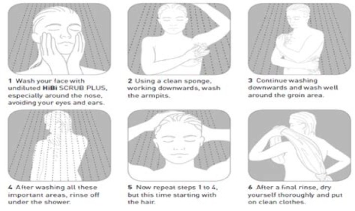 Pay particular attention to your hair, genital area, groin and armpits. Ensure Hibiscrub remains on your skin for at least 60 seconds for it to be effective, then rinse and dry your skin thoroughly. Hair washing: Use Hibiscrub as a shampoo and wash your hair twice in the five days. Avoid contact with your eyes.