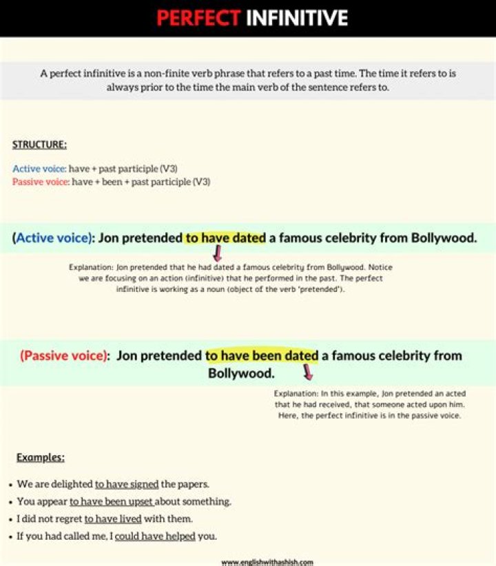 In English grammar, the passive infinitive is an infinitive construction in which the agent (or performer of the action) either appears in a prepositional phrase following the verb or is not identified at all. It is also called the present passive infinitive.