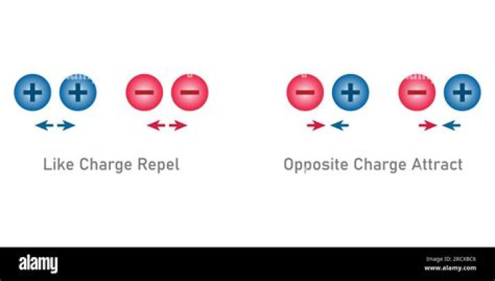 Electric charge can be positive or negative (commonly carried by protons and electrons respectively). Like charges repel each other and unlike charges attract each other. In ordinary matter, negative charge is carried by electrons, and positive charge is carried by the protons in the nuclei of atoms.
