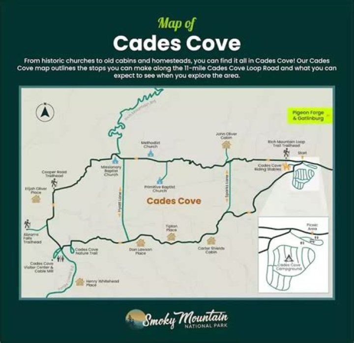 An 11-mile, one-way loop road circles the cove, offering motorists the opportunity to sightsee at a leisurely pace. Allow at least two to four hours to tour Cades Cove, longer if you walk some of the area’s trails.