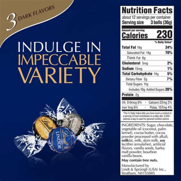 Lindor 70% Cocoa Dark Chocolate Shell (3 balls) contains 12g total carbs, 11g net carbs, 19g fat, 2g protein, and 220 calories.