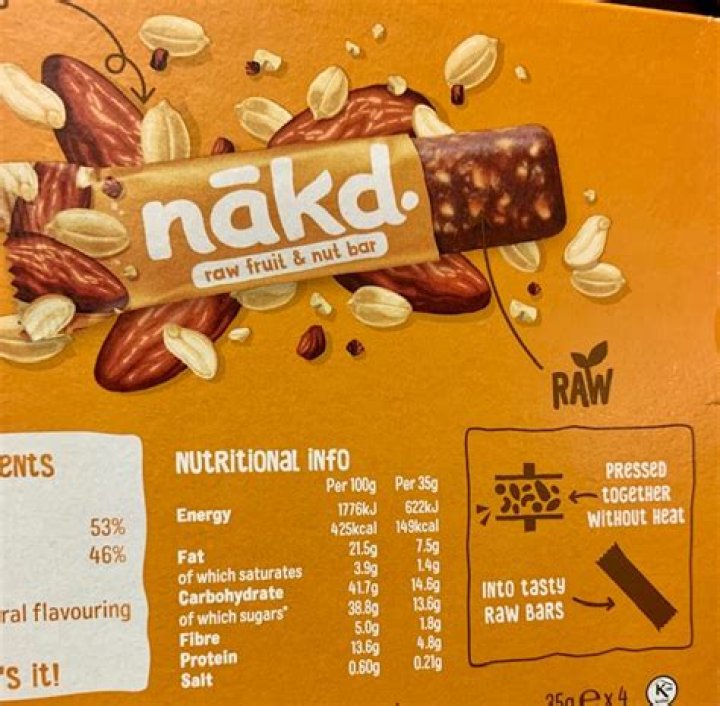 Nakd. INGREDIENTS: Dates (40%), CASHEWS (40%), Raisins (14%), Cocoa (5%), a hint of natural flavouring. * Calories from alcohol is an estimate, and may include artificial sweeteners and sugar alcohols….Region: UK.