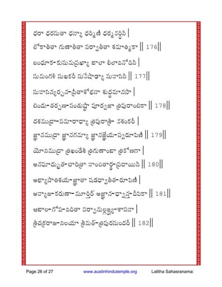 4] Regular chanting of Sree Lalitha Sahasranama will ward off premature death, will provide a long and contended healthy life. Fever can be cured by religiously chanting Sree Lalitha Sahasranamam by touching on a persons forehead. The number of times you chant the more benefit you are likely to get.