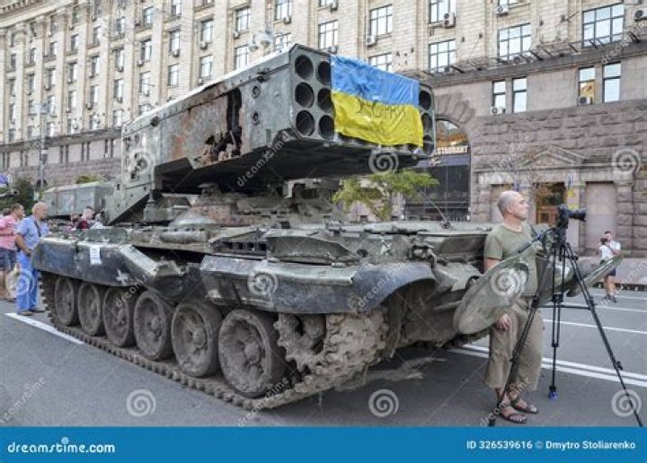TOS-1 (Russian: тяжёлая огнемётная система [ТОС-1], Heavy Flamethrower System) is a Soviet 220 mm 30-barrel (original system, Object 634 or TOS-1M) or 24-barrel (Object 634B or TOS-1A) multiple rocket launcher and thermobaric weapon mounted on a T-72 tank chassis.