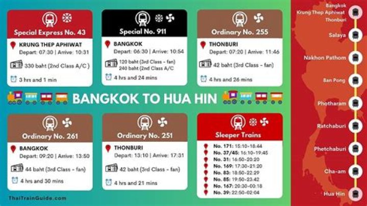 The train from Bangkok to Hua Hin departs 11 times daily from Hualamphong station, taking between 3.5 hours to 4.25 hours to cover the 229 km distance and costs from 44 Baht for a seat in a 3rd Class Ordinary train to over 1,000 for a 1st Class ticket.