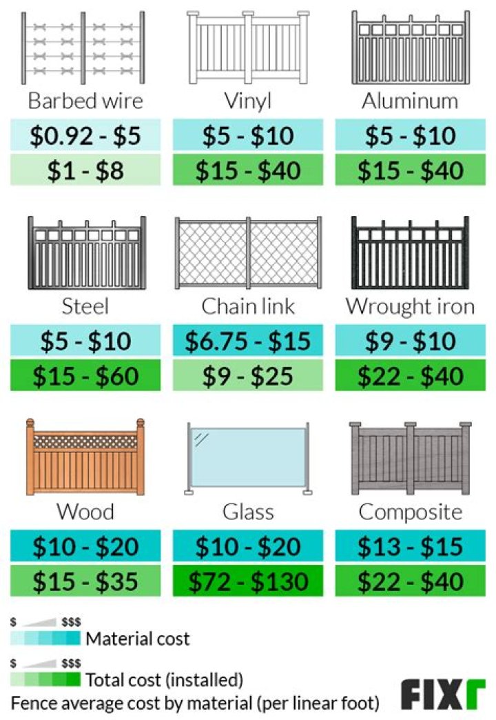 There are several types of material that can be used for your fence project, and installation varies in price from about $5 – $55 per linear foot. There are a range of aesthetic options including wood, vinyl, aluminum, and chain link. Fencing is often measured and priced by the linear foot, learn how to calculate linear feet .