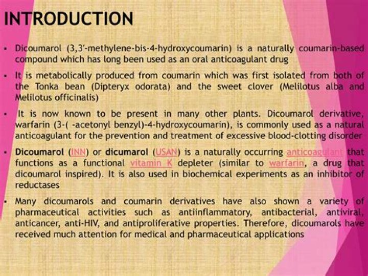 Dicoumarol (INN) or dicumarol (USAN) is a naturally occurring anticoagulant drug that depletes stores of vitamin K (similar to warfarin, a drug that dicoumarol inspired)….Dicoumarol.