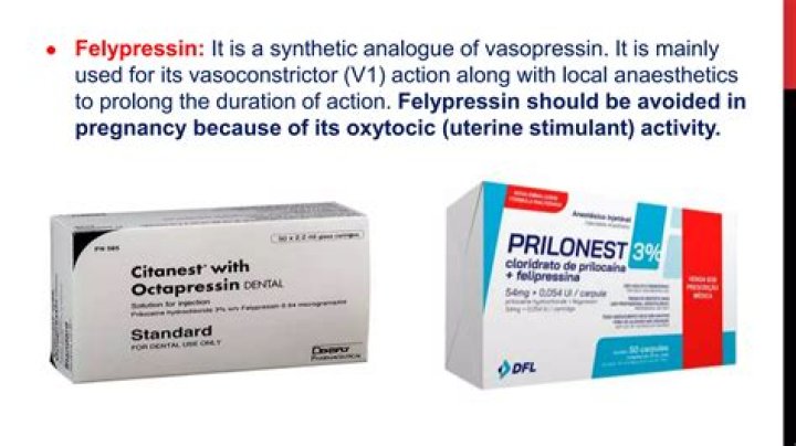 Felypressin is a non-catecholamine vasoconstrictor that is chemically related to vasopressin, the posterior pituitary hormone. It is added to some local anaesthetics such as prilocaine in a concentration of 0.03 IU/ml.