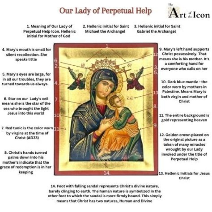 Our Lady of Perpetual Help is a title given to the Blessed Virgin Mary, associated with a Byzantine icon. The icon depicts the Blessed Virgin Mary wearing a dress of dark red with blue mantle and veil. On the left is the archangel Michael and on the right is the archangel Gabriel.