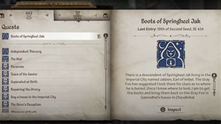 After speaking with Amusei, go to Ganrendel’s house in Cheydinhal and get the job from Gray Fox. He wants you to find where Springheel Jak, a famous thief, is buried and retrieve his magical boots. You are told to start with Jakben, the last descendent of this fabled thief. He lives somewhere in the Imperial City.