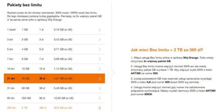 wysyłając SMS o treści PAKIET pod numer 585 (opłata jak za SMS do Orange), wpisując w telefonie krótki kod *110*55# i potwierdzając przyciskiem „zadzwoń” (bezpłatnie), kontaktując się z Biurem Obsługi Klienta pod numerem *100 (opłata za połączenie zgodna z obowiązującym Abonenta cennikiem).