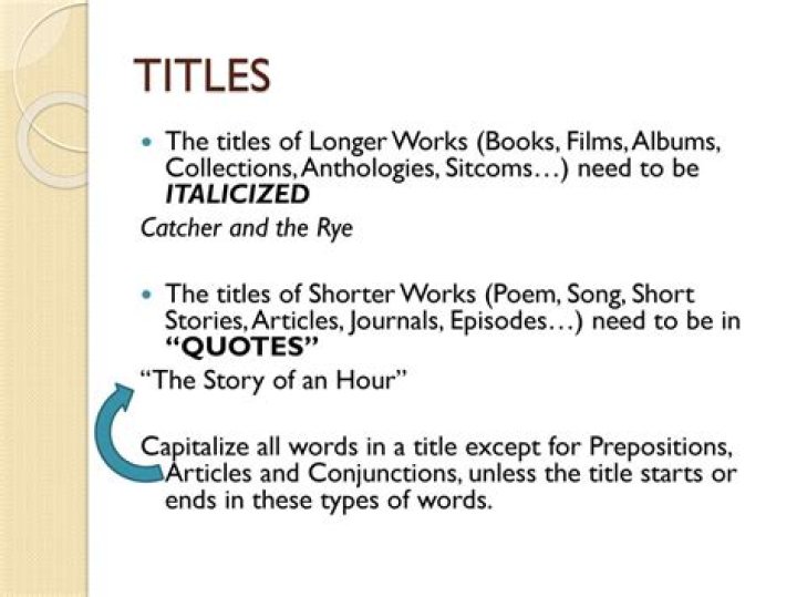 Use underlining or italics, but not both. REMINDER The titles of creative works such as books, movies, works of art, songs, articles, and poems are capitalized. NOTE The titles of poems, songs, short stories, essays, and articles are not underlined or italicized. These titles are set off in quotation marks.