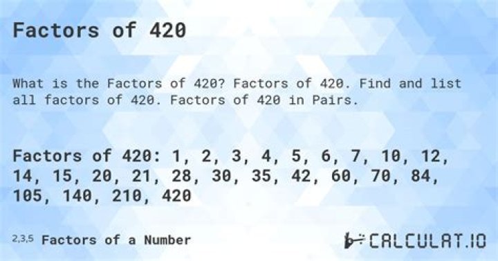 What are factors of 420? The factors of 420 are 1, 2, 3, 4, 5, 6, 7, 10, 12, 14, 15, 20 ,21, 28, 30 , 35, 42, 60, 70, 84, 105, 140, 210 and 420.