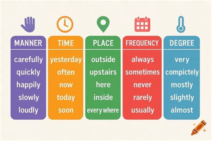There are many different types of adverbs – some describe how we do something (adverbs of manner), some describe how often we do something (adverbs of frequency), and others describe when we do something (adverbs of time). When we want to say where something happens, we use adverbs of place.