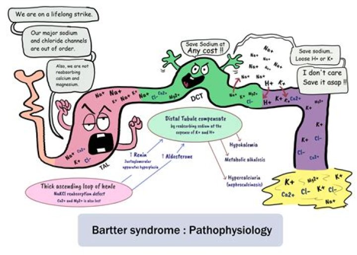 Bartter syndrome is an autosomal recessive disorder of salt reabsorption resulting in extracellular fluid volume depletion with low/normal blood pressure. [1] It is characterized by several electrolyte abnormalities including low potassium and chloride and, in few cases, hypomagnesemia.