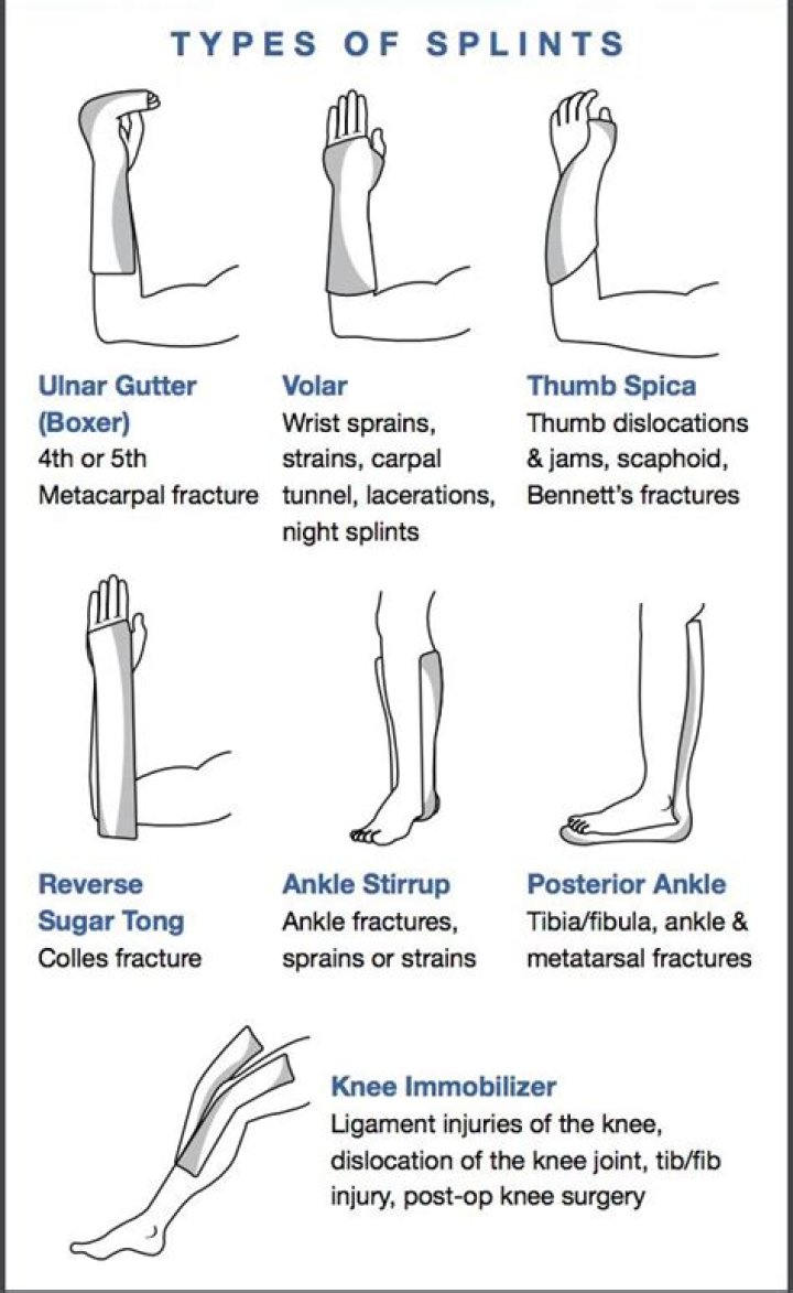 A splint is like a “half cast.” The hard part of a splint does not wrap all the way around the injured area. It is held in place by an elastic bandage or other material. Unlike casts, splints can be easily removed or adjusted. Many splints are custom-made from fiberglass or plaster.