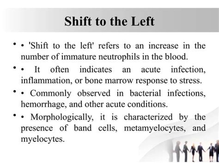 Left shift or blood shift is an increase in the number of immature leukocytes in the peripheral blood, particularly neutrophil band cells. Less commonly, left shift may also refer to a similar phenomenon in severe anemia, when reticulocytes and immature erythrocyte precursors appear in the peripheral circulation.