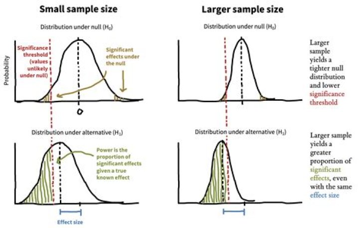 Statistical Power The sample size or the number of participants in your study has an enormous influence on whether or not your results are significant. The larger the actual difference between the groups (ie. student test scores) the smaller of a sample we’ll need to find a significant difference (ie. p ≤ 0.05).