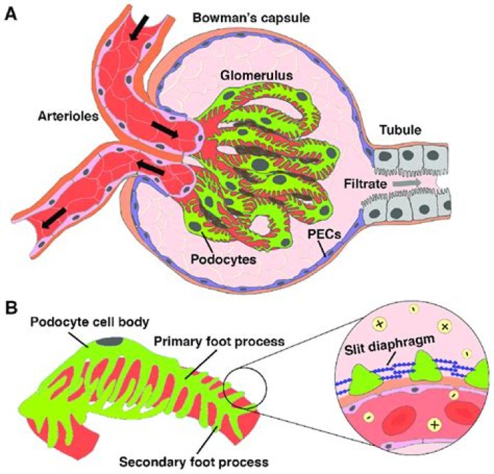 Basement membrane thickening is accompanied by changes of the visceral glomerular epithelial cells (podocytes), which lie on the GBM. There is a progressive loss of podocyte foot processes and narrowing of the filtration slits, while the number of podocytes decreases with increased albumin excretion rate (AER) 4-6.