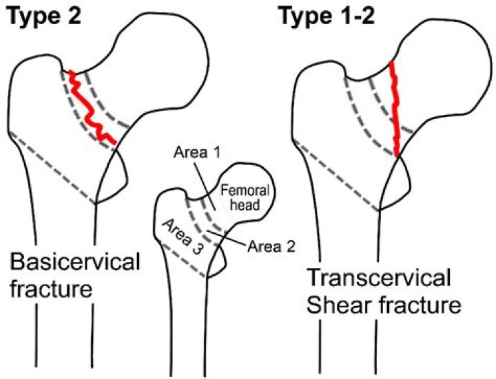 There are three types: subcapital: femoral head/neck junction. transcervical: midportion of femoral neck. basicervical: base of femoral neck.