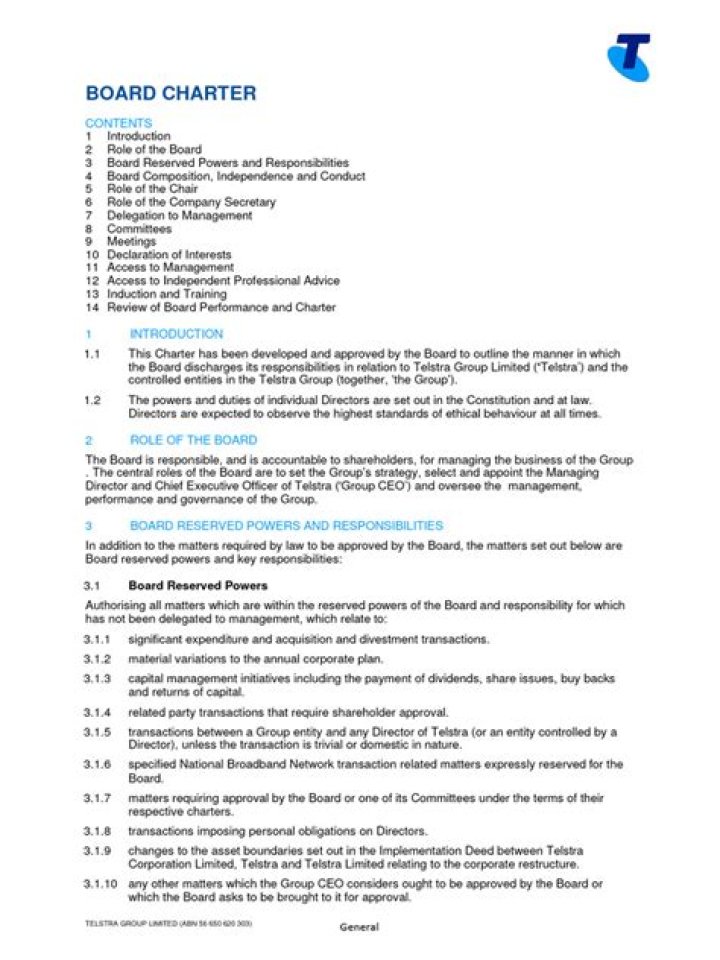 As the top level policy document, the charter: serves as a reminder for the board of the legal framework within which it operates; documents the policies that the board has decided upon to meet its legal and other responsibilities; serves as an induction tool for new directors and senior managers.
