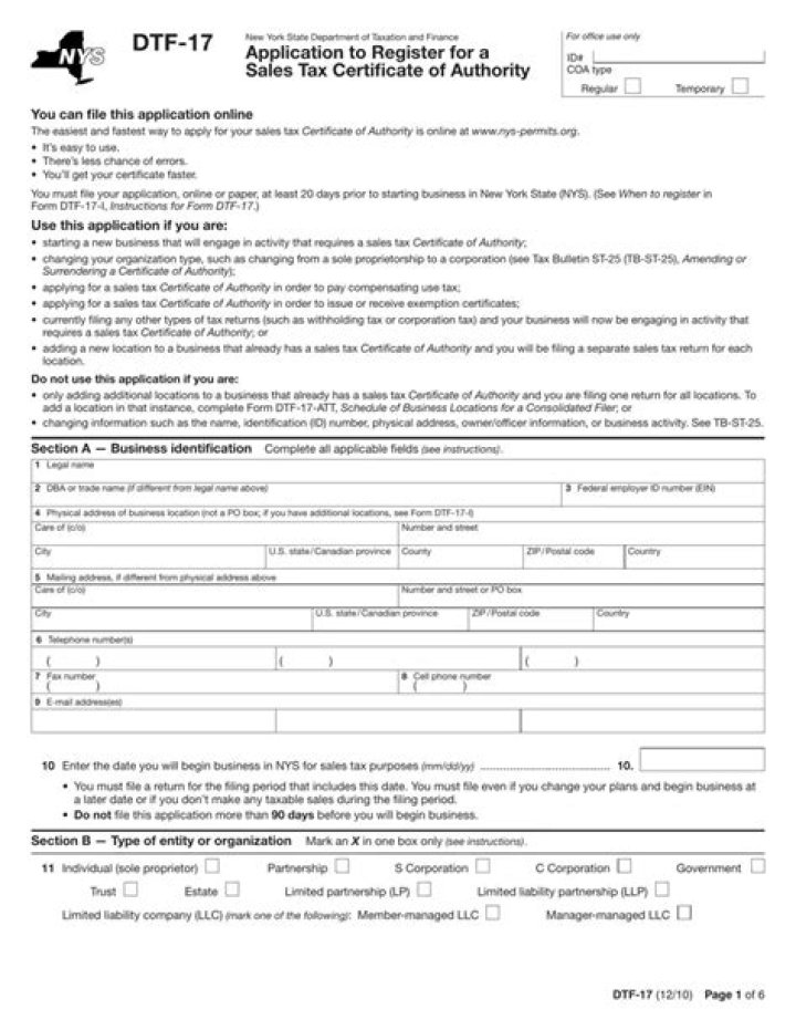 DTF-17-I. (11/18) General information. Complete this application to obtain your sales tax Certificate of Authority, which allows you to collect tax, make taxable sales in New York State (NYS), and issue or accept most sales tax exemption certificates.