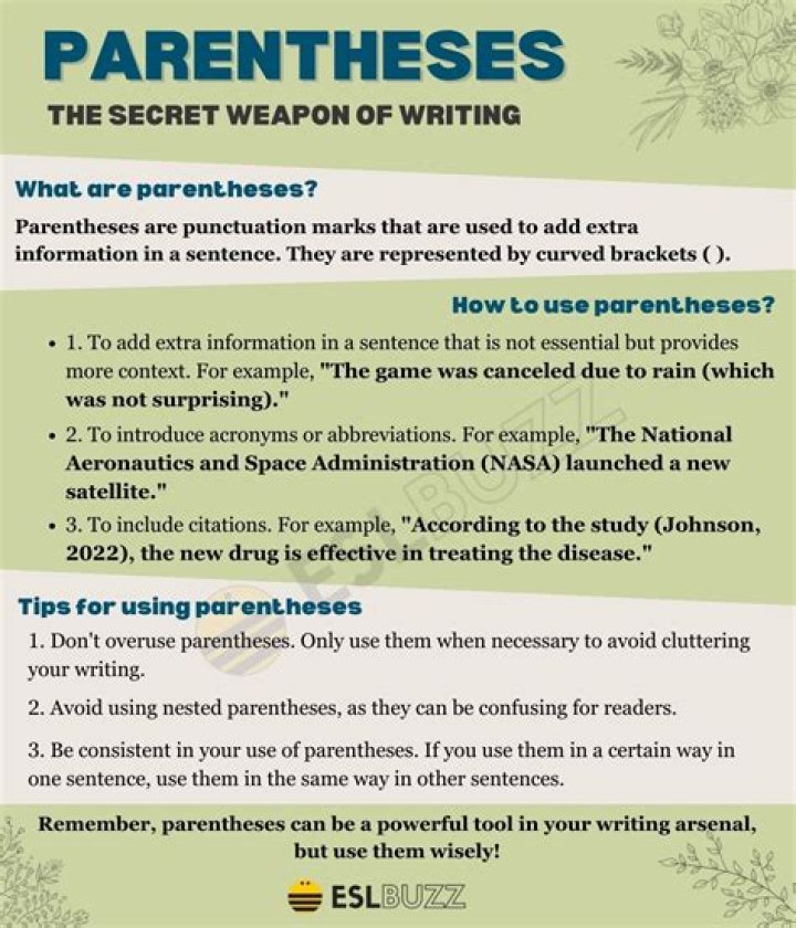 Parentheses are used to enclose incidental or extra information, such as a passing comment, a minor example or addition, or a brief explanation. The writer may choose to put additional information within parentheses or to set off the text using dashes or commas.