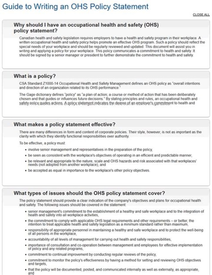 CSA Standard Z1000-14 Occupational Health and Safety Management defines an OHS policy as “overall intentions and direction of an organization related to its OHS performance.” A policy statement indicates the degree of an employer’s commitment to health and safety.