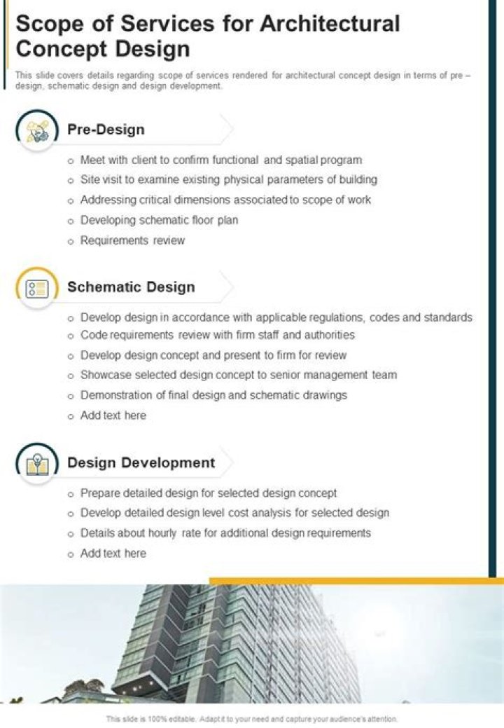 - Include a detailed list of your architectural services, as well as descriptions of each, and the rate or fixed-fee price you charge.