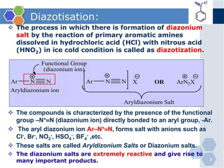 It is a chemical process involved in organic chemistry. – It is the conversion of primary aromatic amine into the diazonium salt of amine by the use of nitrous acid; also known as diazotization.