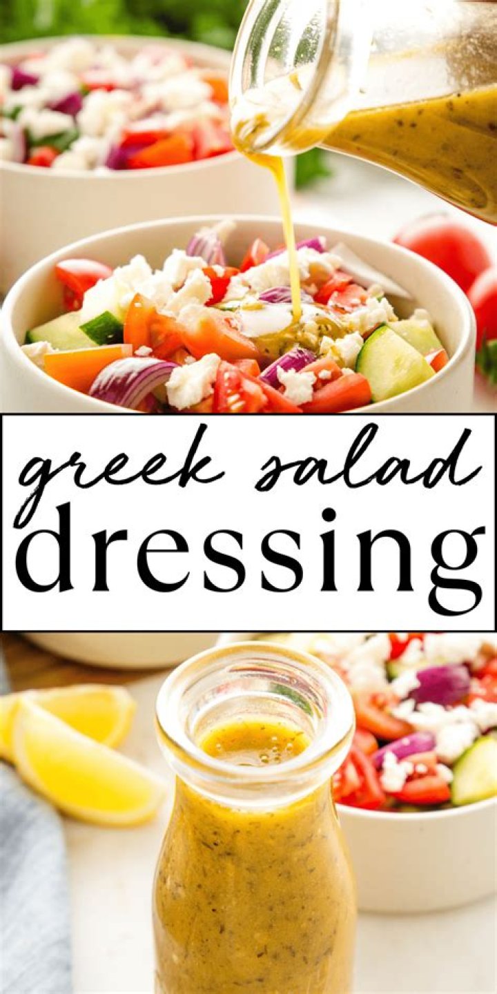 A traditional Greek salad dressing is really a Greek vinaigrette as it contains olive oil, red wine vinegar, lemon juice, Dijon mustard, minced garlic cloves, dried oregano (the key ingredient) and salt and pepper.