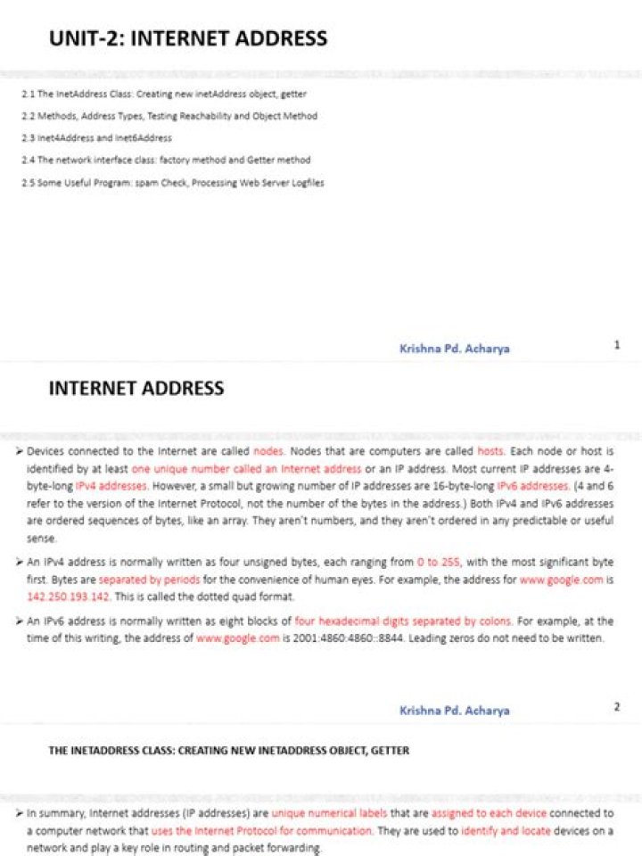 InetAddress class provides methods to get the IP address of any hostname. An IP address is represented by 32-bit or 128-bit unsigned number. InetAddress can handle both IPv4 and IPv6 addresses.