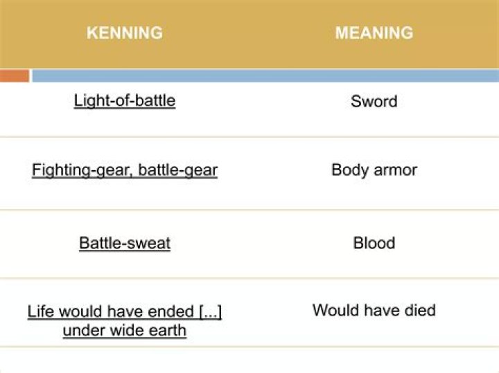 Used primarily in Anglo-Saxon poetry, the epic poem “Beowulf” is full of kennings. For example, the words whale-road is used for the sea and “shepherd of evil” is used for Grendel. Other well known kennings include “battle sweat” for blood; “raven harvest” for corpse; and “sleep of the sword” for death.