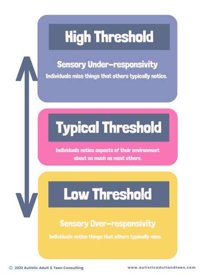 Individuals with low sensory thresholds may be quick to notice and respond to stimuli because their systems are easily activated by sensory stimuli. Individuals with high thresholds may not be as responsive, so they may miss stimuli that others respond to.