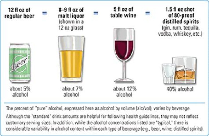 Moderate alcohol use for healthy adults generally means up to one drink a day for women and up to two drinks a day for men. Examples of one drink include: Beer: 12 fluid ounces (355 milliliters) Wine: 5 fluid ounces (148 milliliters) Distilled spirits (80 proof): 1.5 fluid ounces (44 milliliters)