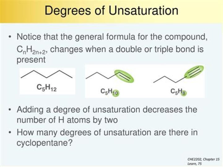 In the analysis of the molecular formula of organic molecules, the degree of unsaturation (also known as the index of hydrogen deficiency (IHD), double bond equivalents, or unsaturation index) is a calculation that determines the total number of rings and π bonds. …