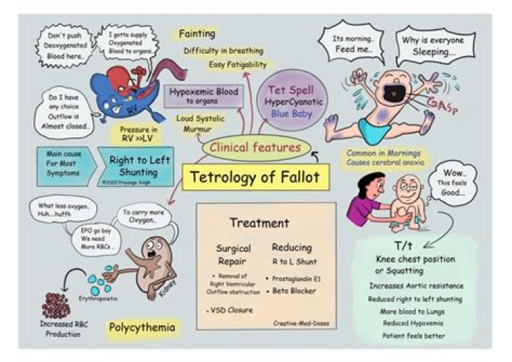 Place infants with hypercyanotic spells in the knee-chest position and give oxygen; sometimes, opioids (morphine or fentanyl), volume expansion, sodium bicarbonate, beta-blockers (propranolol or esmolol), or phenylephrine may help. Repair surgically at 2 to 6 months or earlier if symptoms are severe.