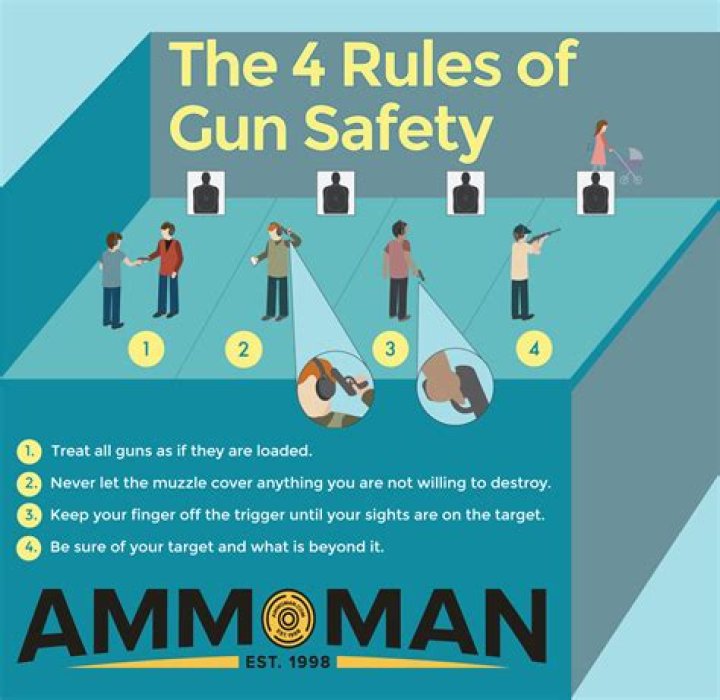 The 4 universal rules of gun safety are: Treat all guns as if they are always loaded. Never let the muzzle point at anything that you are not willing to destroy. Keep your finger off the trigger until your sights are on target and you have made the decision to shoot. Be sure of your target and what is behind it.