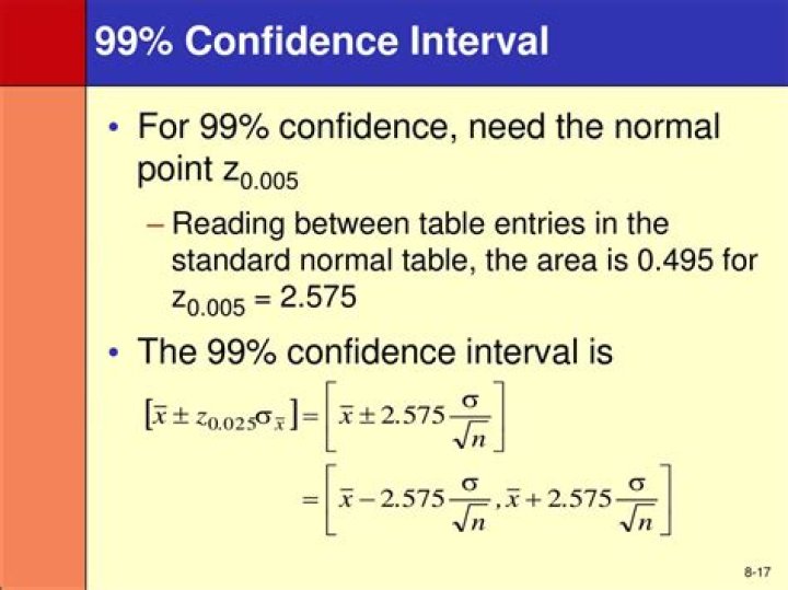 A 99 percent confidence interval would be wider than a 95 percent confidence interval (for example, plus or minus 4.5 percent instead of 3.5 percent). A 90 percent confidence interval would be narrower (plus or minus 2.5 percent, for example).
