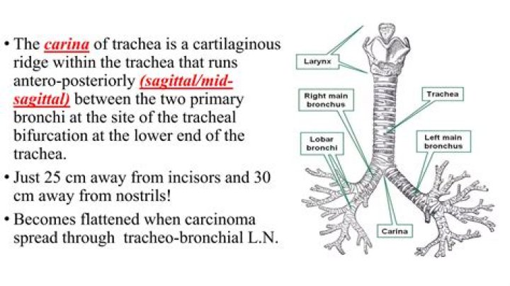 Cartilages of larynx, trachea and bronchi. (Carina is at the point of bifurcation.) Transverse section of the trachea, just above its bifurcation, with a bird’s-eye view of the interior.