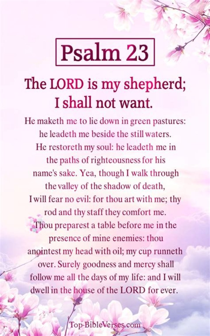 Psalm 23 is one of the most well known psalms in the Bible and was written by King David, an ancestor of Jesus Christ. It is also called the Shepherd Psalm: Translation in the King James Version of the Bible: 23:1 The Lord is my shepherd; I shall not want.