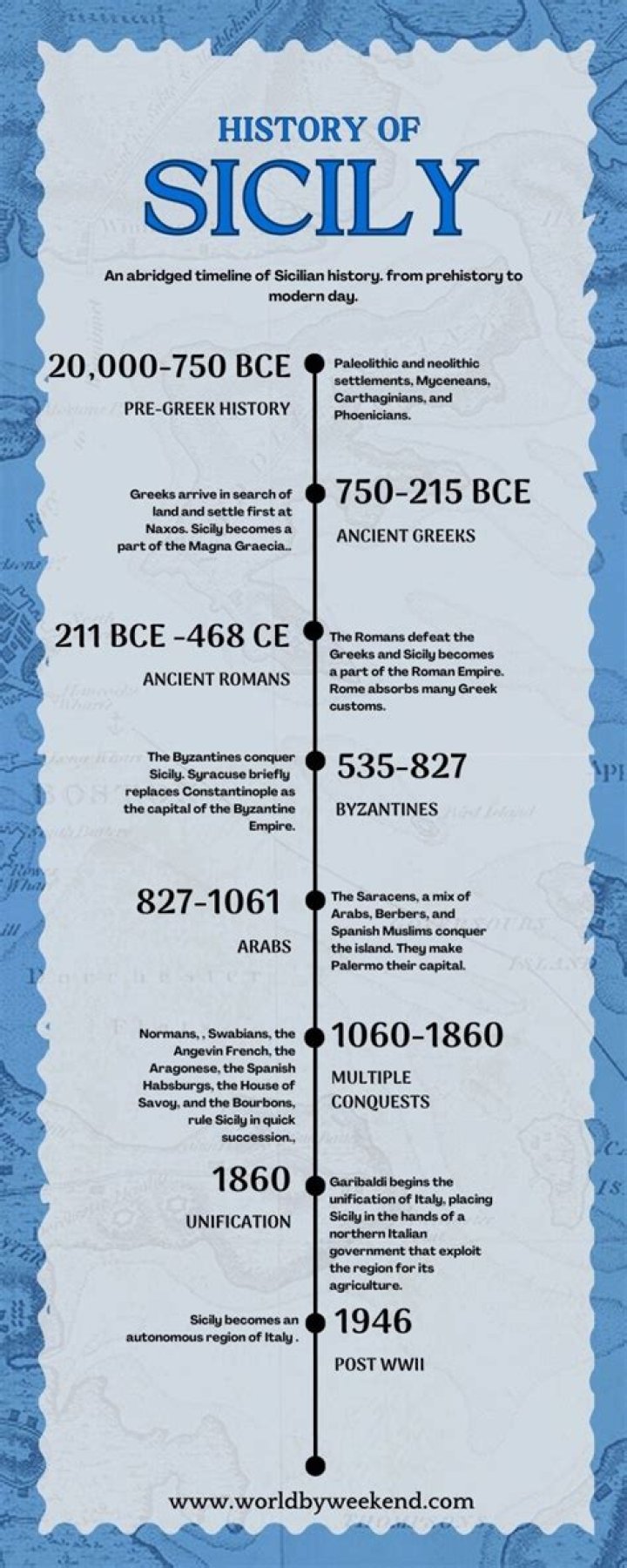 Sicily was inhabited 10,000 years ago. Its strategic location at the centre of the Mediterranean has made the island a crossroads of history, a pawn of conquest and empire, and a melting pot for a dozen or more ethnic groups whose warriors or merchants sought its shores.