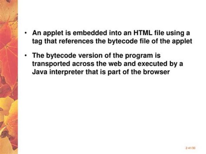 Applets are designed to be embedded within an HTML page. When a user views an HTML page that contains an applet, the code for the applet is downloaded to the user’s machine. A JVM is required to view an applet. The JVM can be either a plug-in of the Web browser or a separate runtime environment.
