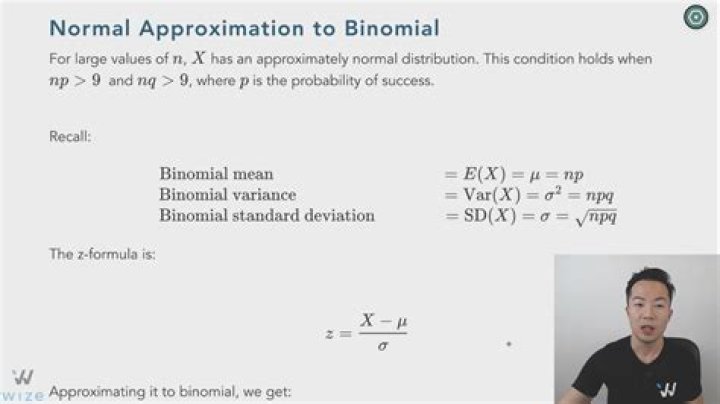 Then the binomial can be approximated by the normal distribution with mean μ=np and standard deviation σ=√npq. Remember that q=1−p. In order to get the best approximation, add 0.5 to x or subtract 0.5 from x (use x+0.5 or x−0.5).